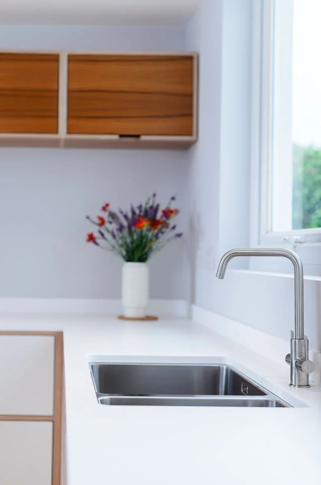 Design response: Small spaces require special attention… careful placement, orientation and thought for function. Careful placed cabinets and the beauty of showering a space with light, allowing it to bounce around as much as possible was the main aim here. A handle less and consealed hinge design gives door surfaces a pure and uninterrupted feel. The worktops selected here are Minerva white and offers a clean attractive surface to prepare ingredients after a busy day.