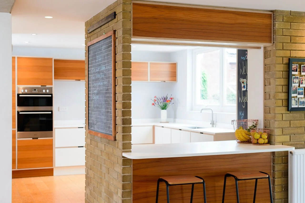 Design response: Our time spent designing and hand building this kitchen for our client was a true pleasure. At Margetts kitchens we always feel honoured when asked to be part of such a unique project. With clean lines and handles design we used an honest construction method for these kitchen cabinets. Selecting a teak veneer on birch ply and allowing the geometry of the edges to create contrast, enriching the bespoke character of this unique beautiful kitchen. Opening up the wall over where the breakfast bar now sits, lets the kitchen re-engage with the rest of the open plan design and pays tribute to the original intentions of the Architect ideas.